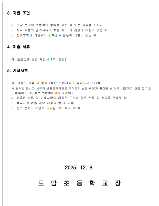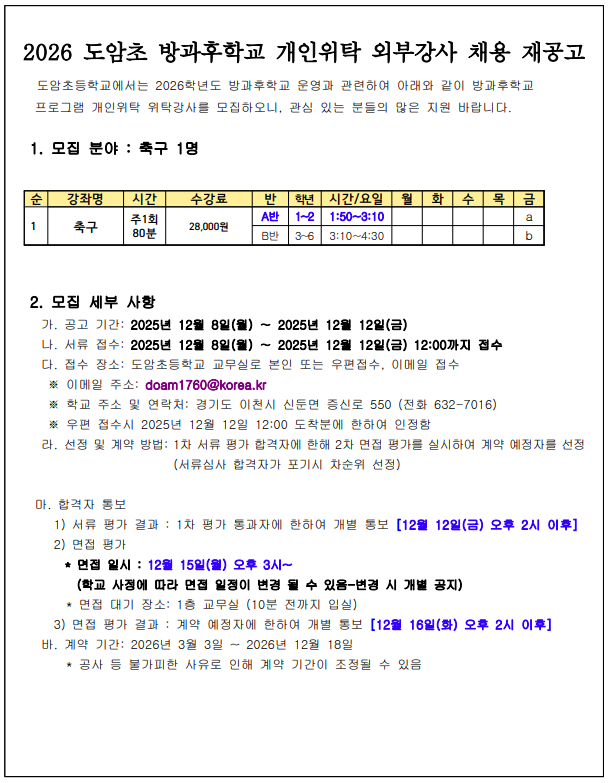2026학년도 도암초등학교 방과후학교 프로그램 개인위탁 외부강사 모집 공고(축구)